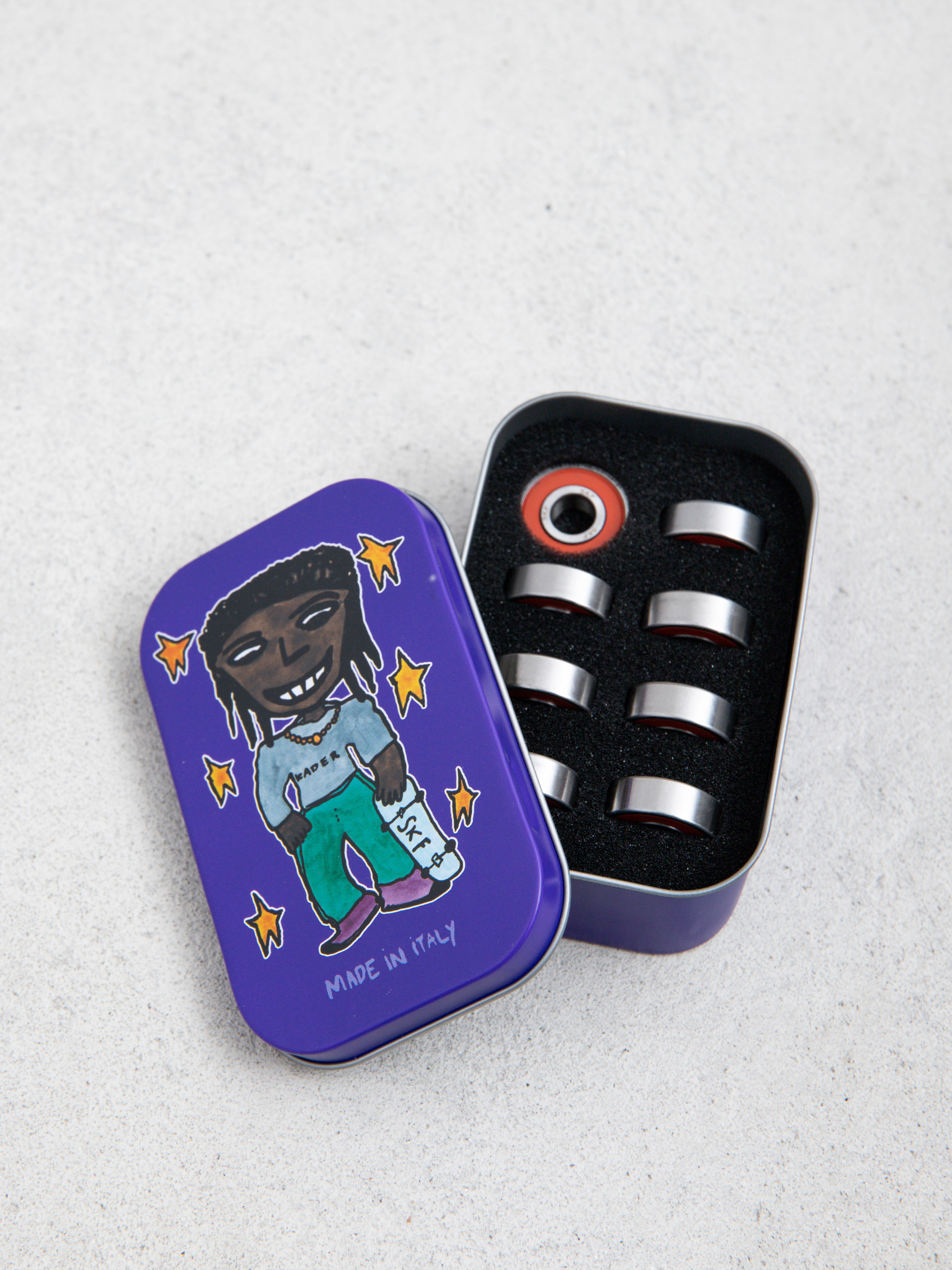 • Ložiská SKF Kader Sylla Signature sú oceľové ložiská testované na doske, ktoré sú navrhnuté na hladkú a presnú jazdu. Predom naolejované oceľové guľôčky zaručujú odolnosť a výkon, zatiaľ čo laserové gravírovanie na vonkajšom krúžku zdôrazňuje jedinečný charakter modelu. Sada obsahuje 8 ložísk s gumovými krytmi, zabalených v kovovej škatuľke.