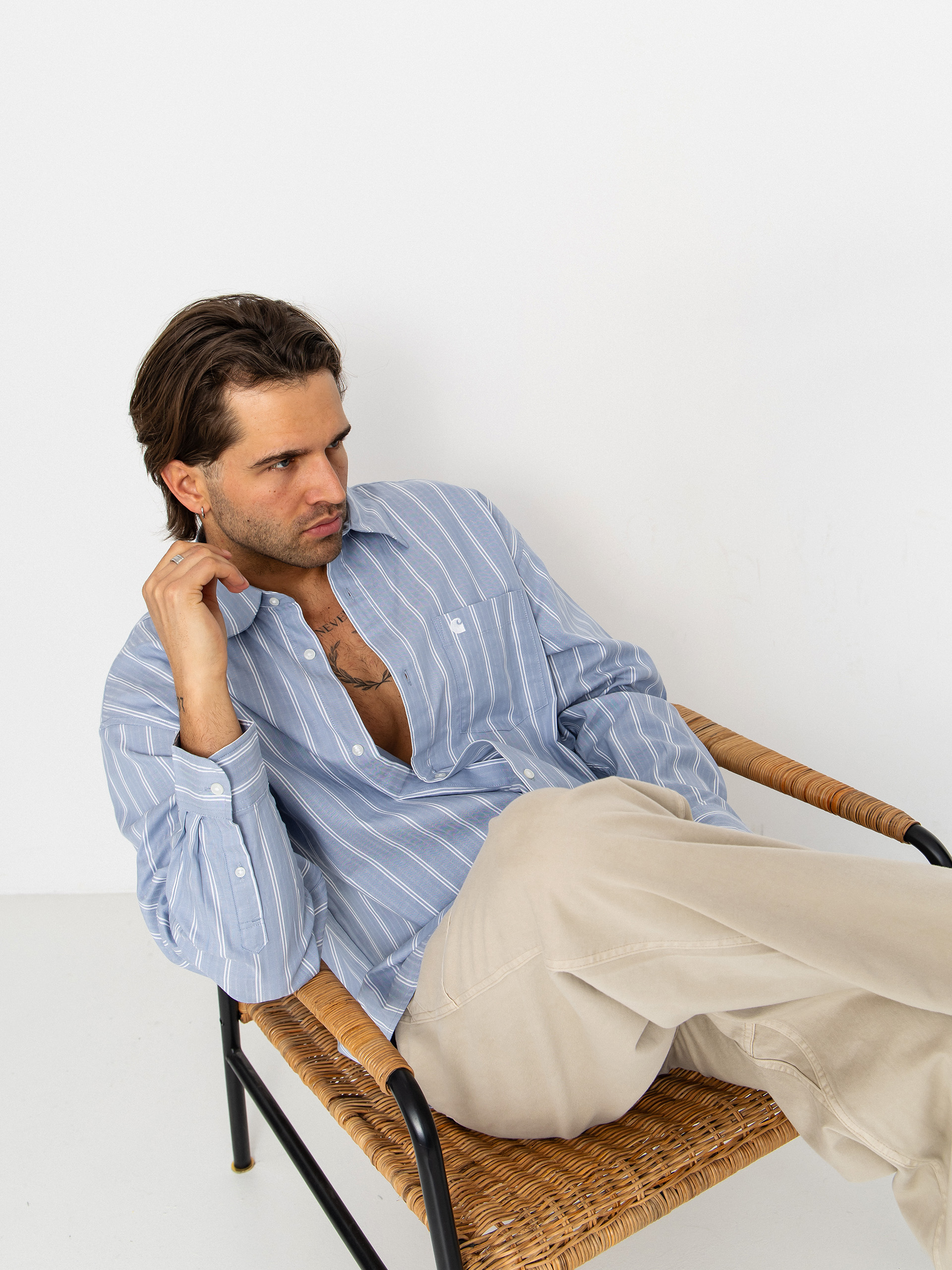 • Carhartt WIP Beale je ľahký, vzdušný kúsok s uvoľneným strihom, ideálny na každodenné nosenie pracovného oblečenia a streetwear štýlu. Je vyrobený z dobby bavlnenej tkaniny s na dotyk príjemnou textúrou a má jemný pruhovaný vzor, ktorý mu dodáva charakter a kvalitné remeselné spracovanie. Voľný strih poskytuje voľnosť pohybu a pohodlie, zatiaľ čo vďaka klasickému golieru a dlhému rukávu je košeľa vhodná na ležérne aj rafinovanejšie outfity. Na hrudi sa nachádza vrecko s vyšitým logom „C”, ktoréósú minimalistickým, rozpoznateľným akcentom značky Carhartt WIP.