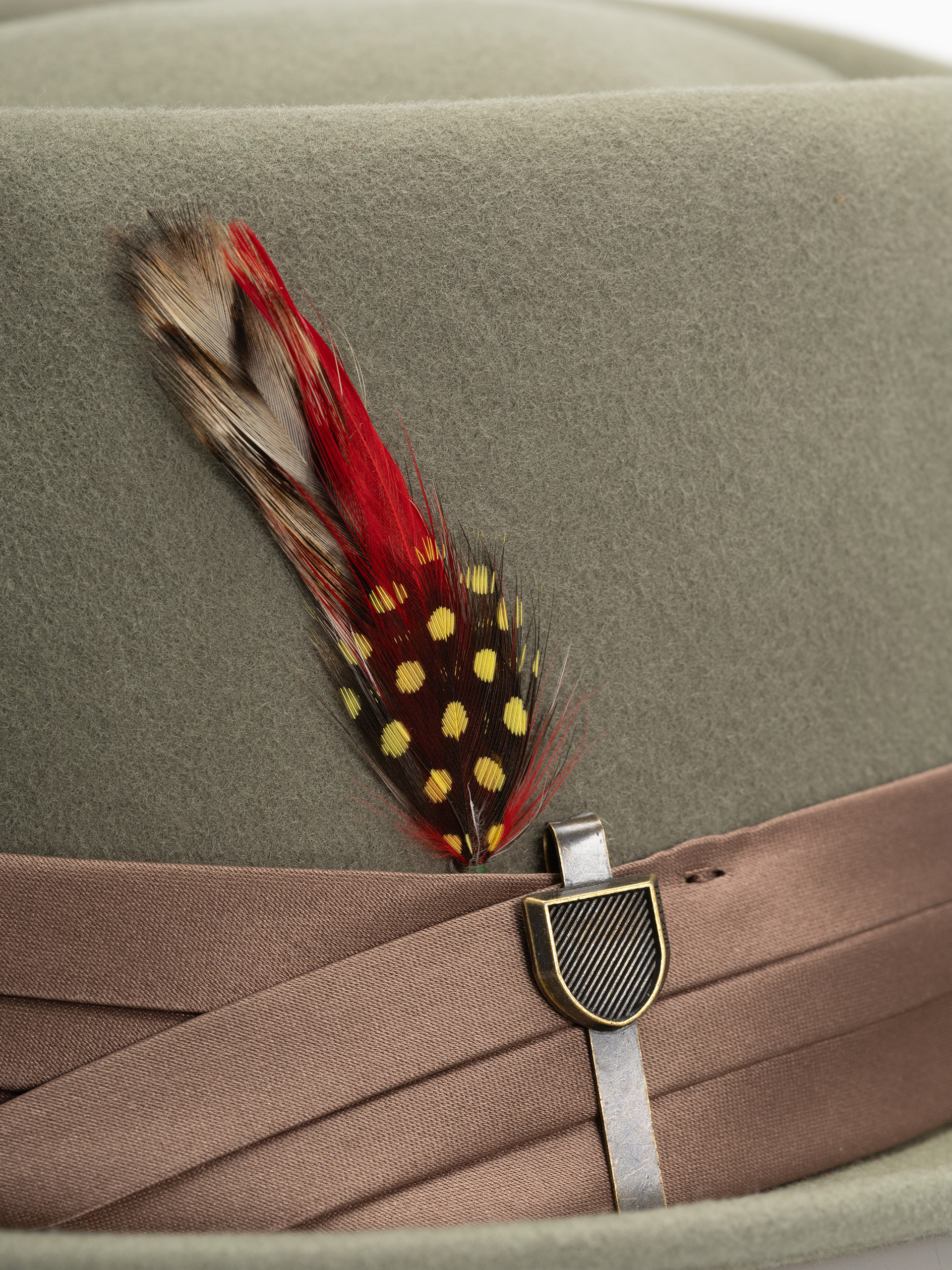 • Brixton Stout Pork Pie je elegantný plstený klobúk s krátkou strieškou zdobený saténovým pásikom, pierkami a kovovým špendlíkom s vyrytým logom Brixton
